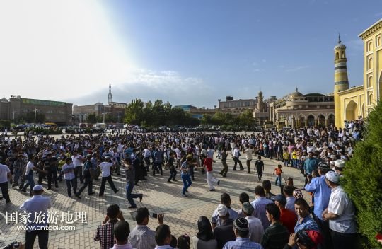 8月8日,穆斯林群眾完成禮拜后在新疆喀什的艾提尕爾廣場上跳起傳統(tǒng)舞蹈“薩滿舞”。