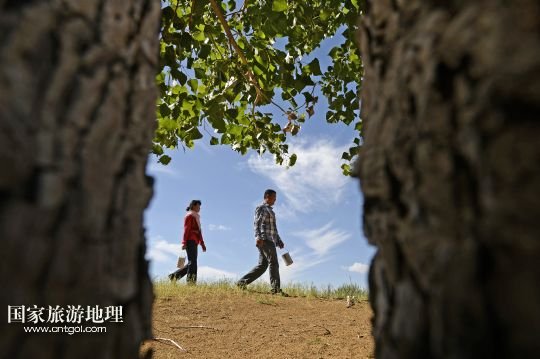 顧蕓香與丈夫在治沙現(xiàn)場查看已經(jīng)成材的大樹(7月23日攝)。
