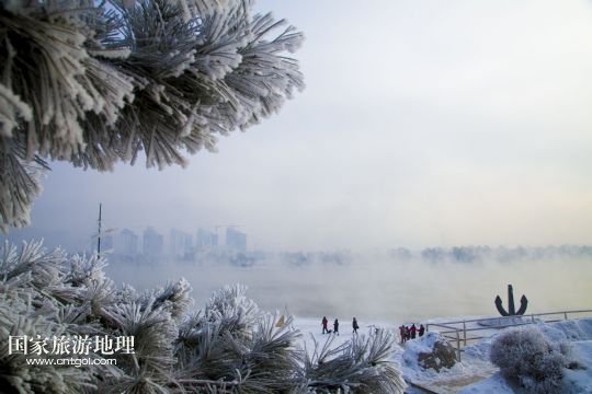 當日是冬至,吉林市氣溫降至零下二十攝氏度,松花江岸邊形成的霧凇景觀吸引了眾多游客。