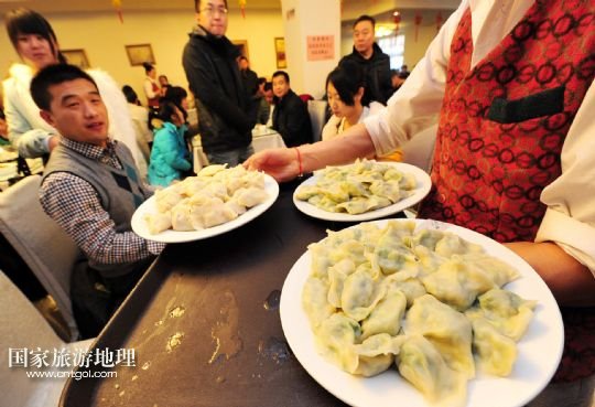 12月22日,寧夏銀川一家餃子館的服務員給顧客上餃子。