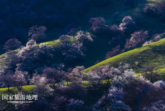 在新源縣吐爾根鄉(xiāng)的原始杏花林一處山坡上,杏花競相綻放(4月10日)。