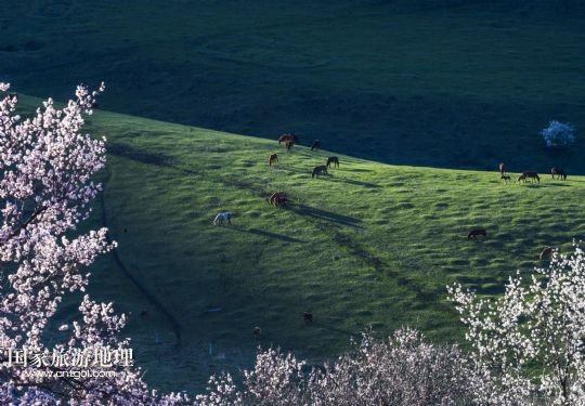 4月10日,在新源縣吐爾根鄉(xiāng)原始杏花林里的山坡上,幾匹駿馬在覓食。