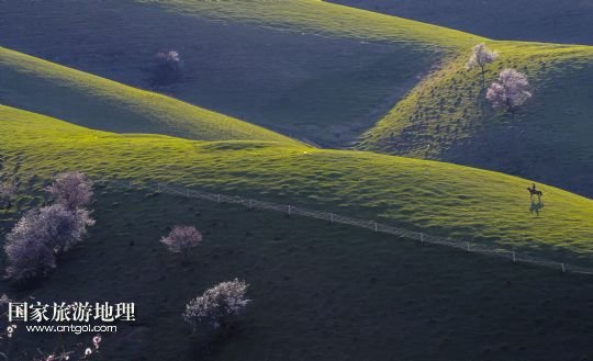 4月10日,在新源縣吐爾根鄉(xiāng)的原始杏花林里,一位牧民騎著馬在放牧。