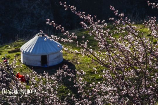在新源縣吐爾根鄉(xiāng)原始杏花林里,哈薩克族的一個氈房被盛開的杏花包圍著(4月9日攝)。