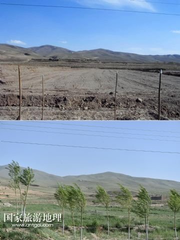 國家旅游地理 寧夏中衛(wèi)6月9日訊 上圖上:2014年5月的資料照片上甘鹽池一片荒涼;上圖下:6月4日,記者拍攝的甘鹽池已是綠意盎然(拼版照片)。寧夏海原縣甘鹽池地處黃土高原干旱帶上,平均海拔約2100米,年均降雨量在280毫米左右,自然災害頻繁,十年九旱。2014年以前,這片近12萬畝的土地可謂一片荒蕪。2014年,海原縣甘鹽池管委會通過確立“盆地改良、種草養(yǎng)羊、綠化美化、提升人氣”的工作思路,對2.2萬畝砂石地和山坡地進行改良和治理,如今甘鹽池滿滿的綠意讓人為之一振。 新華社記者 李然 攝