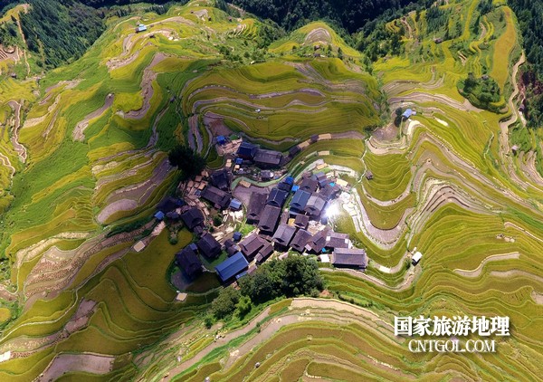 9月5日,貴州省黔東南苗族侗族自治州從江縣加榜鄉(xiāng)黨扭村和加車村近萬(wàn)畝水稻開鐮收割。圖為:鑲嵌在田園中的苗家吊腳樓。
