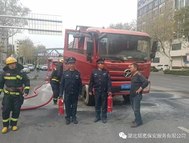 面對突如其來的變故,貨車司機緊急停車,下來時由于過度緊張,以至于重重摔倒在地,當(dāng)時司機疼痛難忍,更不知何滅火。危急關(guān)頭,我公司駐荊楚理工學(xué)院東門的保安員金鵬程(男,55歲,中共黨員,荊門城區(qū)人)和趙兵(男,55歲,漳河新區(qū)人)發(fā)現(xiàn)險情后,迅速從值班室提起滅火器沖向著火的貨車,一左一右對準起火部位進行噴射滅火。